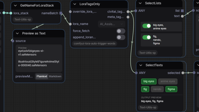 ComfyUI関連 [ComfyUI]LoRA自動タグ補助+テキスト編集系ノードを作りました。 ComfyUIのLoRAタグ管理を効率化する自作ノードを紹介。複数のテキスト結合や、LoRA名・タグを抽出してトグルボタンで選択できる「SelectTexts」など、プロンプト入力を劇的に楽にするツール群の使い方と活用例を解説。 2026.03.19 ComfyUI関連customNodes